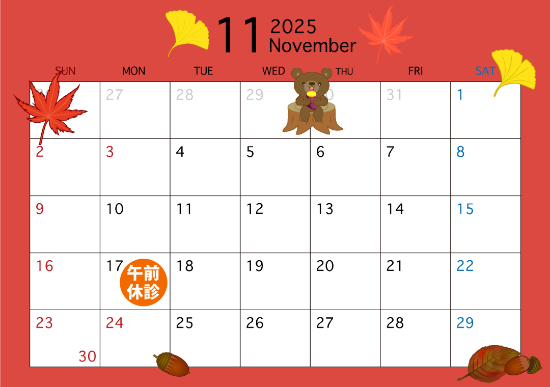 11月休診日のお知らせ お知らせ 2025.11.102025.11.11 11月17日午前休診とさせていただきます。 お電話でのお問い合わせは午後2時から対応しております。 ご理解の程、よろしくお願いいたします。